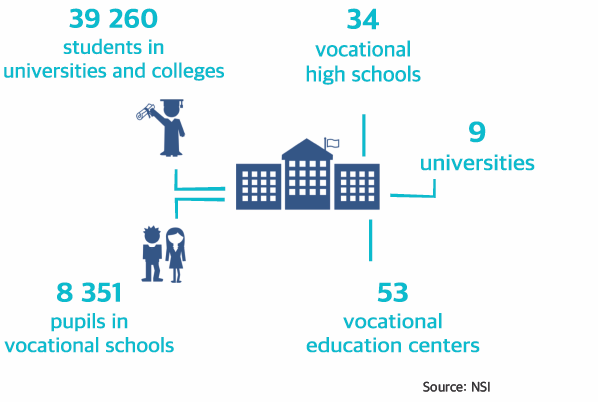 There are 39 260 students enrolled in universities and colleges and 8351 pupils in vocational high schools. Those were spread amongst 7 universities, 2 colleges and 34 vocational high schools.