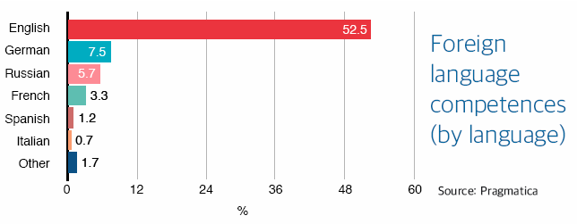 People who use German (7.5 %) and Russian (5.7%) are similar in proportion and the level of proficiency in both languages is generally high. Much less popular among the target group are French, Spanish and Italian - the proportion of people who speak one of these languages is between 1-3 %.